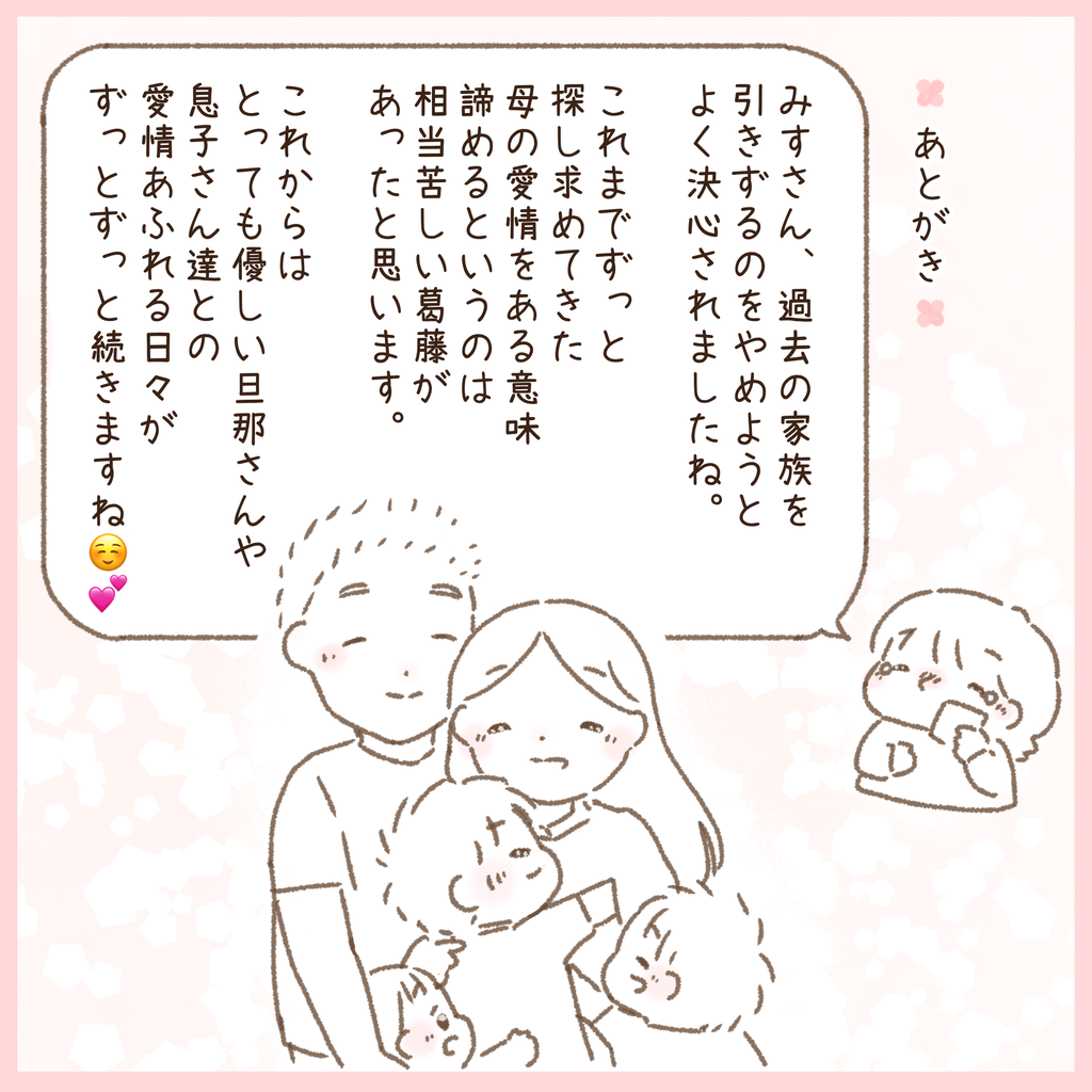 この度は素敵な漫画にしていただき、ありがとうございます。中々重苦しいエピソードも、私の大好きな柔らかく、可愛いイラストのおかげで、ほっこり見ることが出来ました。リアルな話なので、すっきりしないし、厳しいご意見もいただくだろうな、と覚悟していました。