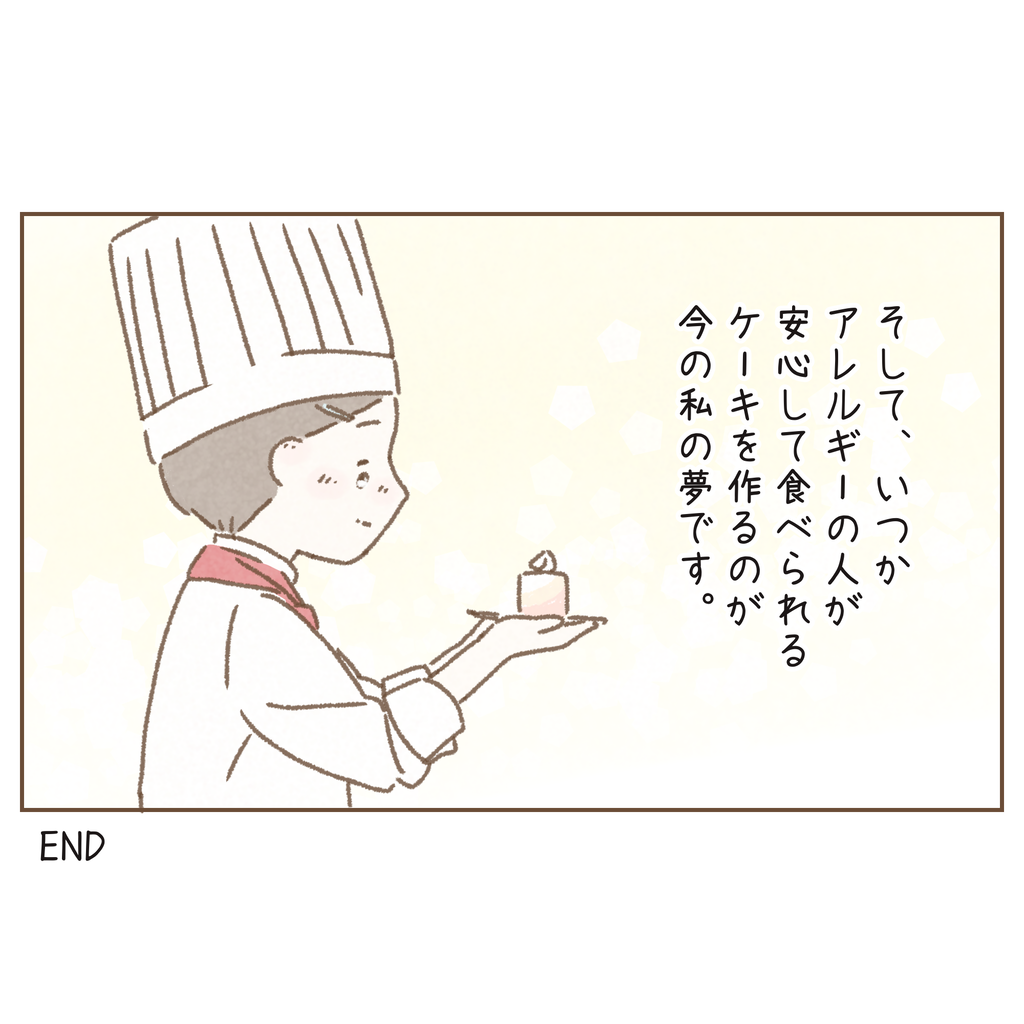 アレルギー、辛いですよね。みんなと同じものが食べられない、ましてや目標とするものを思うように目指せなかったというこのお話をよんで、そういうこともあるよなと栄養士として改めて学ばせていただきました。今のご時世、アレルギーについても世の中の理解が深まってきていると思いますし、だからこそこの方にしか作れないケーキやスイーツがあると思います。上から目線のようになってしまいますが、是非応援したいです!