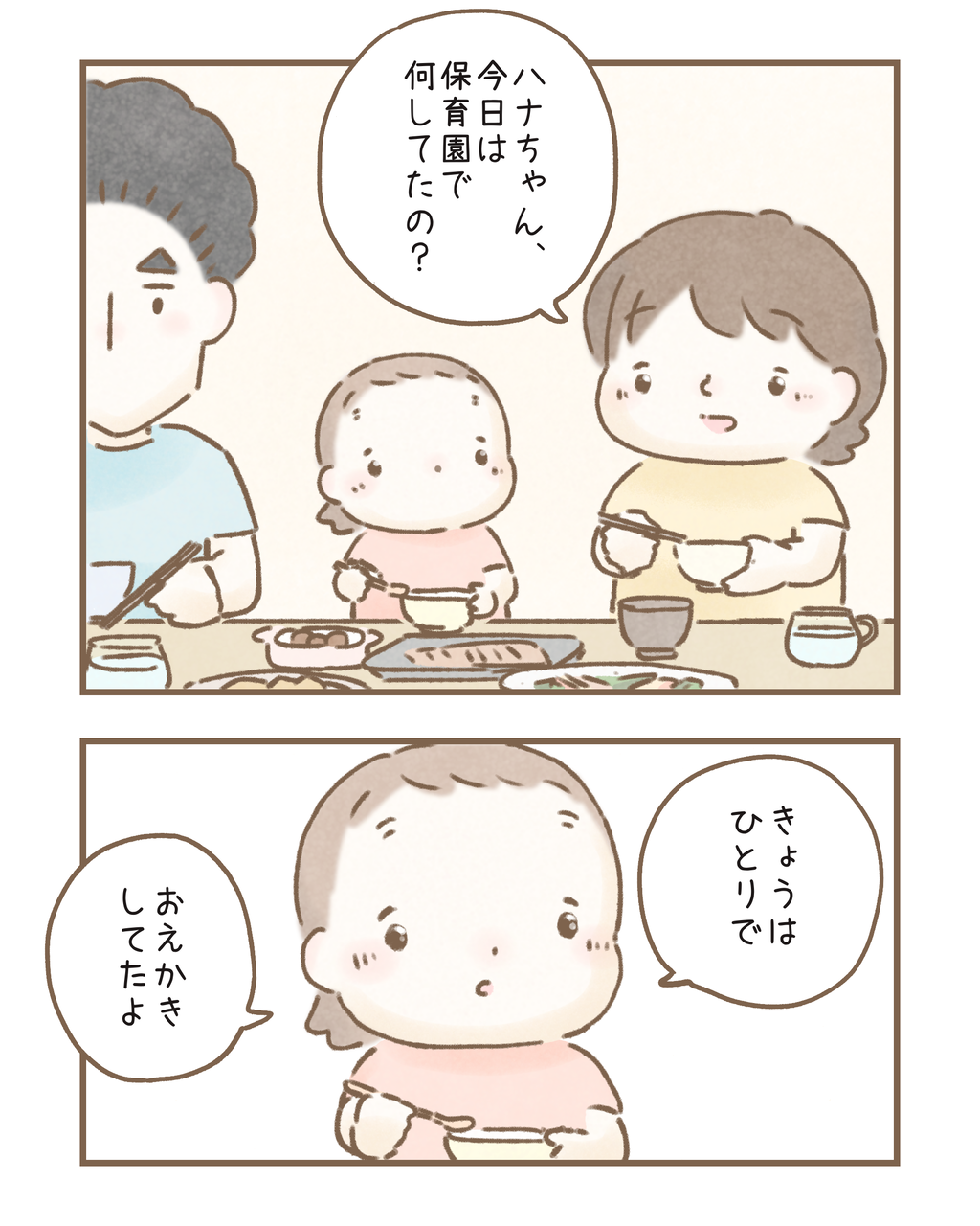 『ひとり』 2022/05/19 心配でつい余計な一言を言ってしまう所でした…(;´Д`Aもし私が「寂しくなかった?」って聞いてしまったらその声色からハナちゃんはひとりで遊ぶのは寂しくてママが心配することだと気にしてしまっていたかもしれません…(;´Д`A🔻前回のハナちゃん🔻 🔻LINE公式アカウント🔻🔻ハッピーエピソード募集中です♡🔻エピソードを送って下さった皆様誠にありがとうございます🙇♀️できる限りたくさん描かせて頂きます🙇♀️♡ 「子育て絵日記」カテゴリの最新記事 < 前の記事次の記事 > コメント コメント一覧 (4) 1. はちこ 2022/05/19 19:27 旦那さんの声かけ、素敵です! 私もきっと「寂しくなかった?」「明日はお友達と遊んだらどうかな?」とか言ってしまいそうです😞 0 nishiyamatomoko がしました 2. にらやま 2022/05/19 19:48 私も一人であそぶ力のある子はすごいなと思ってました!我が子は一人で遊ぶのが苦手です。お友だちの輪に入れない時期があって、「今日は一人であそんだんだ…」って悲しそうに言ってくるのを聞くと…。そんな時に一人で楽しめることがある子は本当にすごいと思うんです。ハナちゃんすごいなーと思うし、旦那さん本当に素晴らしいと思います! 0 nishiyamatomoko がしました 3. まみ 2022/05/19 23:39 うちも1人で遊ぶのが大好きな子で、お迎えに行くと大体1人で塗り絵かパズルをしてて…たまに帰りの車でお友達と遊ぶのも楽しいよ♪とか言ってしまいます😅余計なお世話ですよね。もっと一人遊びが上手なことを褒めてあげようと思いました☺️ 0 nishiyamatomoko がしました 4. あんこ 2022/05/20 00:20 ご主人もすてきだし、ご主人の対応をすてきだと感動できるともこさんもすてきです♥ 0 nishiyamatomoko がしました コメントフォーム 名前 コメント 記事の評価 リセット リセット 顔 星 情報を記憶 コメントを投稿する 【コメント投稿時の注意事項】投稿いただいたコメントはライブドアスタッフの確認後に公開されます。夜間帯にいただいたコメントは翌日の公開となるケースもございますので、ご了承くださいませ。