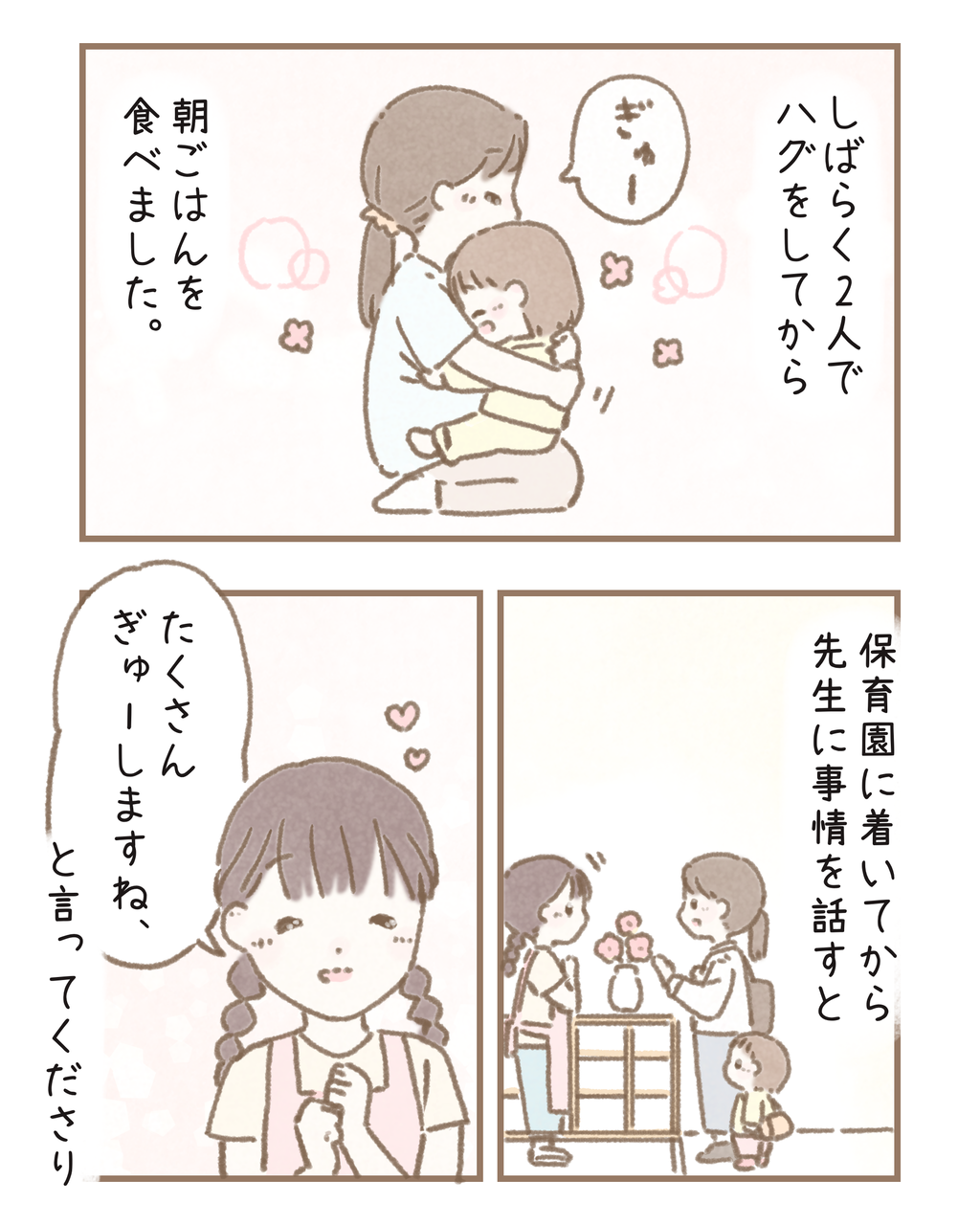 あの日以来娘とのハグの時間を大切にしようと意識するようになりました。親が子どもに教えるだけではなく、子どもに気付かされて親も育つんだなと思う日々です。