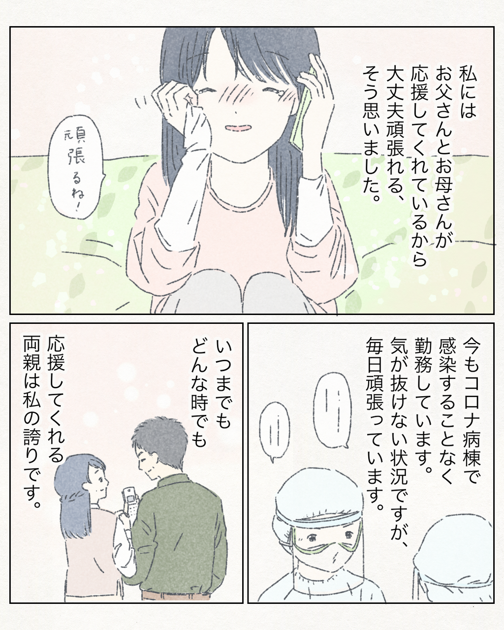 ハッピーエピソード#106『両親』 2021/01/15 ハッピーエピソード#106『両親』 こちらは、ぷうさんから頂いたエピソードです。コロナウイルス感染症対応に頑張って下さっているぷうさん!本当にお疲れ様です🙇♀️ぷうさんの様な方が相応しい応援を受けることを願わずにいられません。ご両親も心配する気持ちがあるでしょうに、ぷうさんの決断を信じてぷうさんの背中を押す言葉を伝えられるなんて素晴らしいご両親ですね😭💕私もぷうさんに感謝と応援を🙇♀️大変な状況下ですが、ぷうさんが健康に日々を送れるよう祈っております🙇♀️ ぷうさん、素敵なエピソードありがとうございました🙇♀️💕ーーーーーーーーーーーーーコメントありがとうございます(*^^*)有り難く読ませて頂いてます🙇♀️♡ーーーーーーーーーーーーー誤字、脱字がございましたらコメントで教えて頂けますと大変助かります🙇♀️♡ーーーーーーーーーーーーー↓登録ありがとうございます🙇♀️💕↓励みになります☺️❣️↓ハッピーエピソード募集中です☺️💕↓ 「ハッピーエピソード」カテゴリの最新記事 < 前の記事次の記事 > コメント コメント一覧 (32) 1. ミッチー 2021/01/15 12:08 医療従事者さん達には、頭が下がるばかりです。 0 nishiyamatomoko がしました 2. ぷうさんへ 2021/01/15 12:13 頑張ってくれてありがとう御座います。 0 nishiyamatomoko がしました 3. Charlie 2021/01/15 12:15 医療従事していらっしゃる方には本当に感謝です。コロナとは関係ないですが、両親が入院しております。いつも助けていただいて感謝しかありません。ありがとうございます。 まだまだコロナ患者が増える日本です。毎日毎日見えない敵と戦うのは精神的にも参ってしまいますよね。身体に気をつけて頑張ってください‼️ 0 nishiyamatomoko がしました 4. この場をお借りして… 2021/01/15 12:54 毎日本当にありがとうございます。 私達も感染しない、させない努力をちゃんとしよう!と改めて思いました。 お忙しいお仕事だと思いますので 頑張りすぎぬよう、お身体にお気をつけて下さいね! 直接お礼は言えないけれど、ぷうさんや医療従事者の方々の目に止まりますように… 0 nishiyamatomoko がしました 5. なっちゃん 2021/01/15 12:57 拝読して、涙が出ました。 私は東京在住です。今現在、私自身 別の病気で入院しないといけない状態ですが、東京はコロナの人数が多すぎて、病床がなく、入院出来ません。スタッフの手が回らないとのことで、検査や診察も困難な状況になってしまっています。 診察で病院へ行くたび、看護師さんや医師、その他の病院の医療従事者の方々の忙しさを目の前にすると、本当にStay Homeして、これ以上皆さんに負担をかけてはダメだと、心から思います。 ぷうさん、本当に同僚からの心ない言葉をかけられながらも、多大な不安と疲労の中、最前線で皆を守ってくださってありがとうございます。何故皆さんが風評被害に合うのか、私には全く意味が分かりませんが、ぷうさんのように頑張っている方々がいるから、私達も今、普通に生活が出来る訳で、本当に感謝しかありません。 ご両親もどんなに心配かと思いますが、応援してくれる素敵なご両親ですね。 もっと様々な形で応援が伝わればいいのですが・・・。今回、この投稿を描いてくださり良かったです。 ぷうさん、更に大変でしょうが、ご自愛なさってください。私達はStay Homeして、感染者を減らせるように、勤めます。 0 nishiyamatomoko がしました 6. ぷうさんや医療従事者の方へ感謝 2021/01/15 13:01 ぷうさんの決心。素晴らしいです。 看護師としてのプライドを持っていらっしゃる姿、優しさ。 全てに頭が下がります。 同僚の人達は、後ろめたいからそんな態度なのでしょうか。。 最前線で働く方々の手当など、きちんと報われるように我々も声を上げたいと思いました。 私たち国民のために、本当にありがとうございます。 0 nishiyamatomoko がしました 7. maa 2021/01/15 13:04 本当に、国の為に働いてくれ、身を削る思いで、立ち向かう姿は、有難い限りです。何もする事ができませんが、私達一般市民は、感染拡大しないよう、日々医療従事者の皆様を想いながら、生活していきます。 0 nishiyamatomoko がしました 8. いつもありがとう。 2021/01/15 13:13 日々危険と隣り合わせのお仕事をされてる医療従事者の方には本当感謝でいっぱいです!! ありがとうございます、そして、頑張ってくれてありがとう。 私たちにできることは、これ以上感染を広げないこと。 みんなで頑張りましょう! 0 nishiyamatomoko がしました 9. とぅぶ 2021/01/15 13:31 義父がコロナに感染し、年始から入院しています。 見事に家庭内感染し、私と娘はかれこれ半月以上自宅から一歩も外に出ておりません。 義父は相変わらず入院中ですが、この方がまあ扱いづらい方で、医師が回診にこないだ、看護師が厳しいだ、ぐちぐち言っています。 看護師さんやお医者様も手を焼いているだろうなぁと安易に想像がつきます。 こんな義