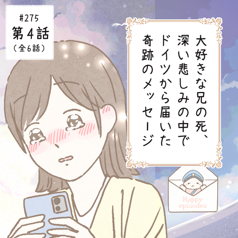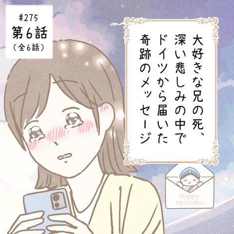 #275『もし生まれ変わりがあるのなら』第6話 2022/12/05 【みんなのハッピーエピソード#275】『もし生まれ変わりがあるのなら』第6話🔻前回のお話🔻 こちらはちりめんさんから頂いたお話をもとにしたマンガです...お兄さんが亡くなって悲しみが癒えない中でのこの出来事は偶然かもしれないけれど温かな奇跡を感じずにはいられ ... 続きを読む